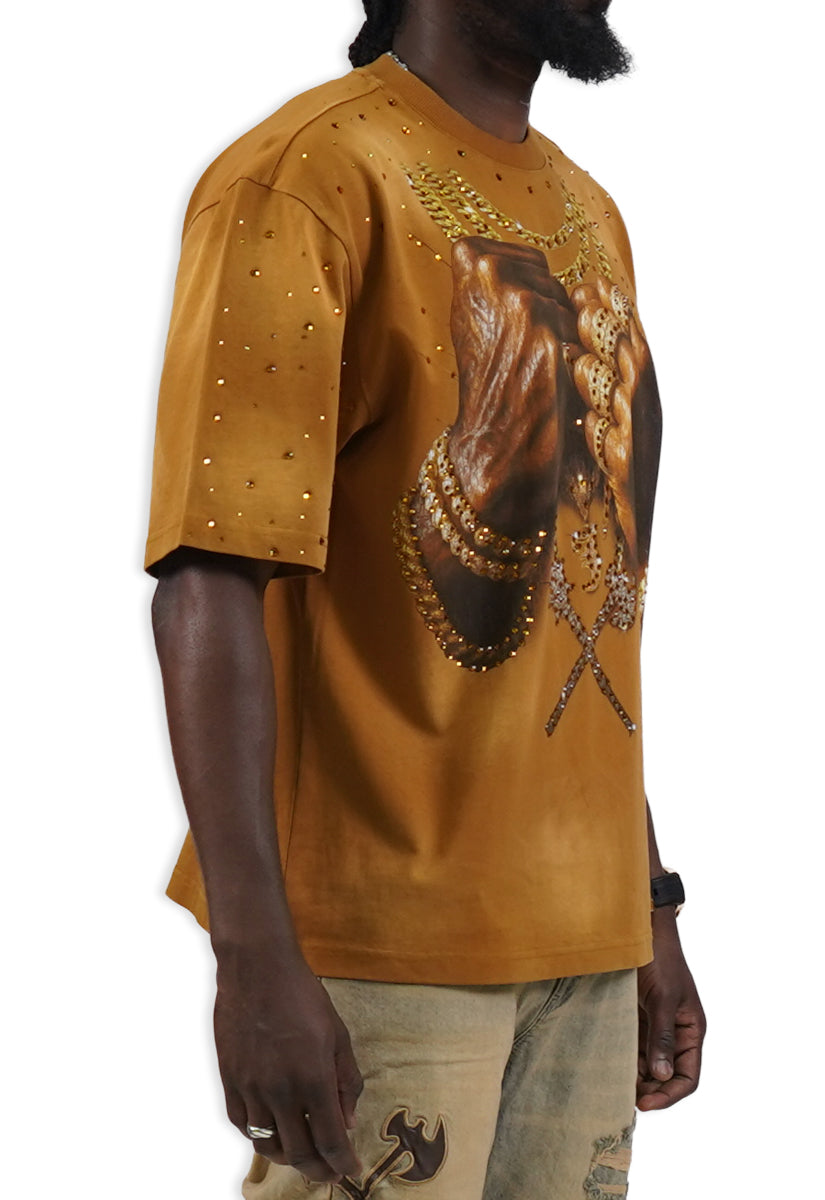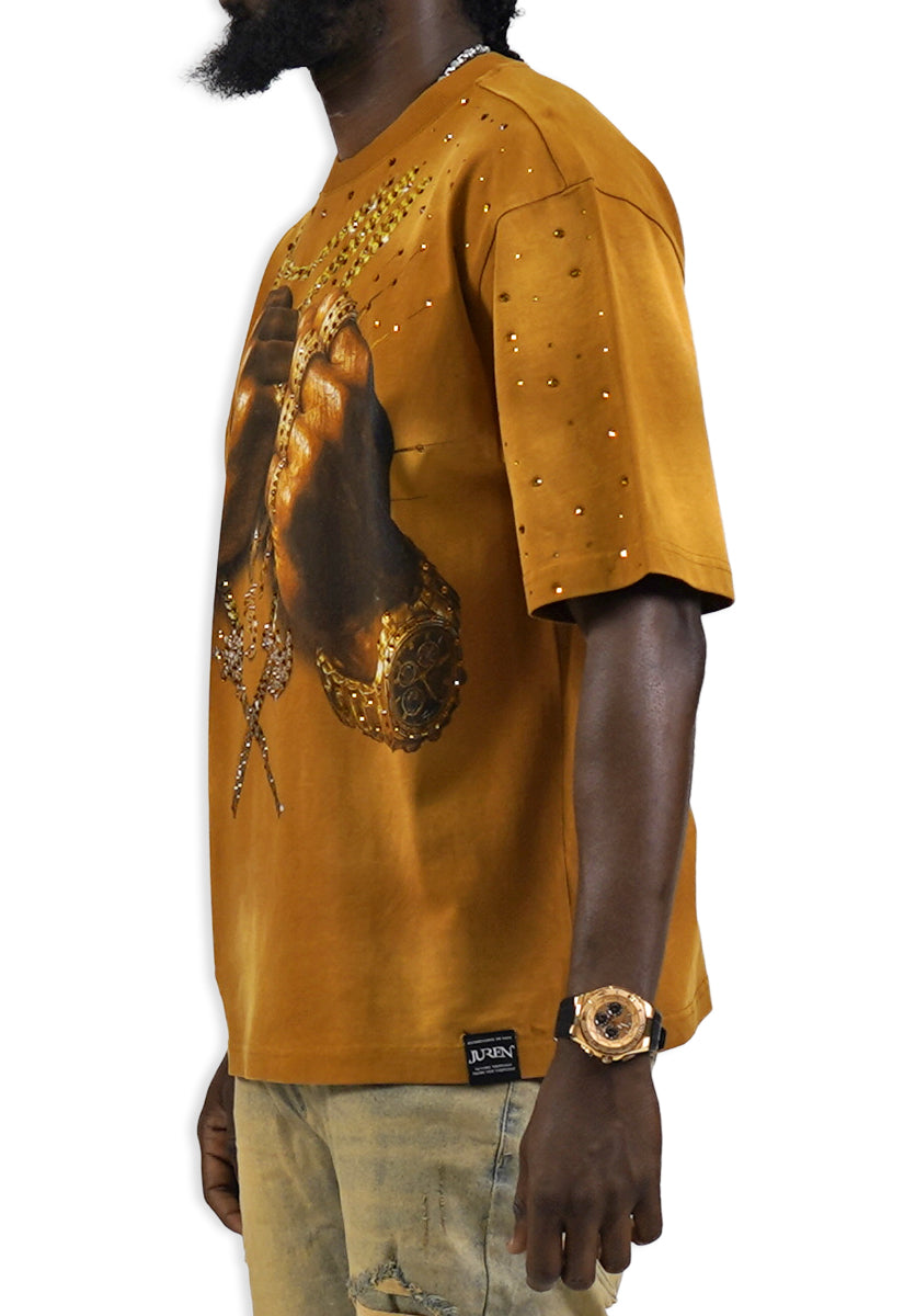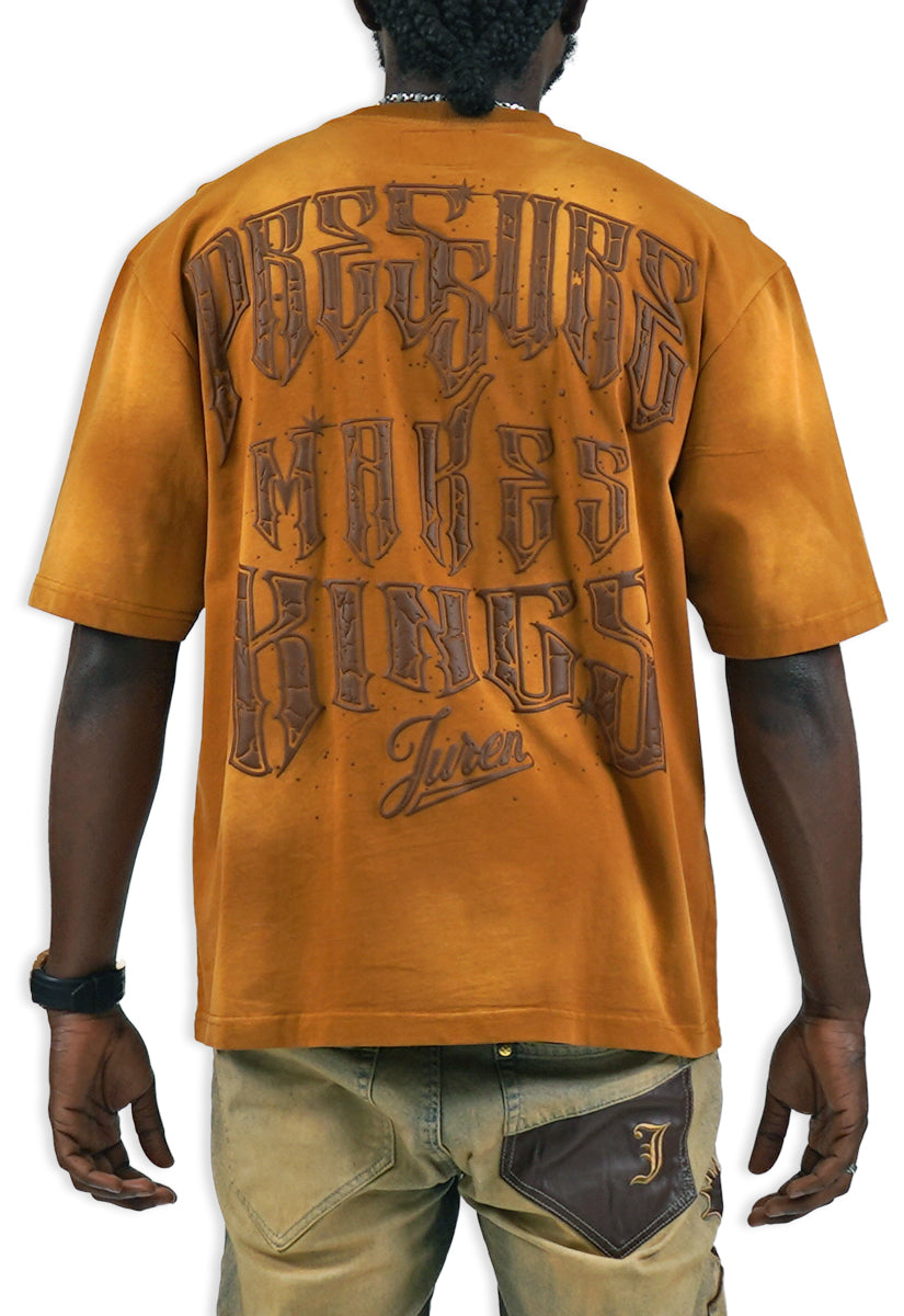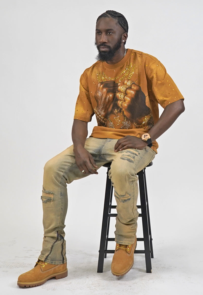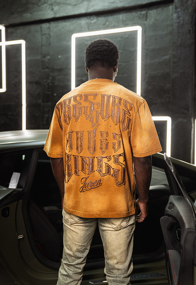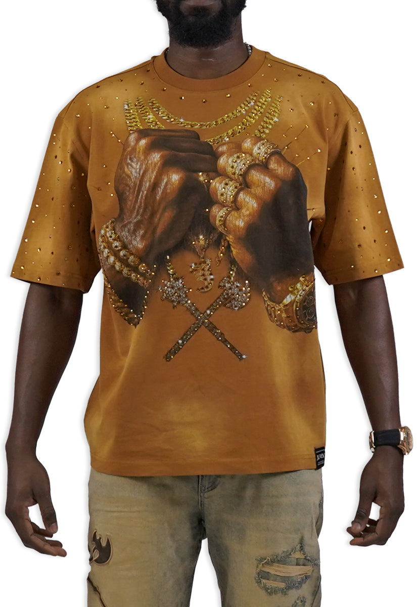 Pressure Makes Kings Light Cloudy Brown Shirt features a striking front design showcasing two powerful fists gripping ornate chains, adorned with rings, watches, and chain bracelets. The entire composition is embellished with Gold rhinestones that catch the light across every metallic element, creating a luxurious, eye-catching aesthetic. The "J" and battle axe are both enhanced with gold rhinestone detailing for added dimension and prestige. The back displays the iconic "PRESSURE MAKES KINGS" statement in bold darker brown puff gel print, accompanied by the Juren signature and battle axe emblem. This premium piece combines bold graphic artistry with meticulous embellishment work, making it a standout statement garment that celebrates ambition and strength. Perfect for those who embrace confidence and distinctive style.