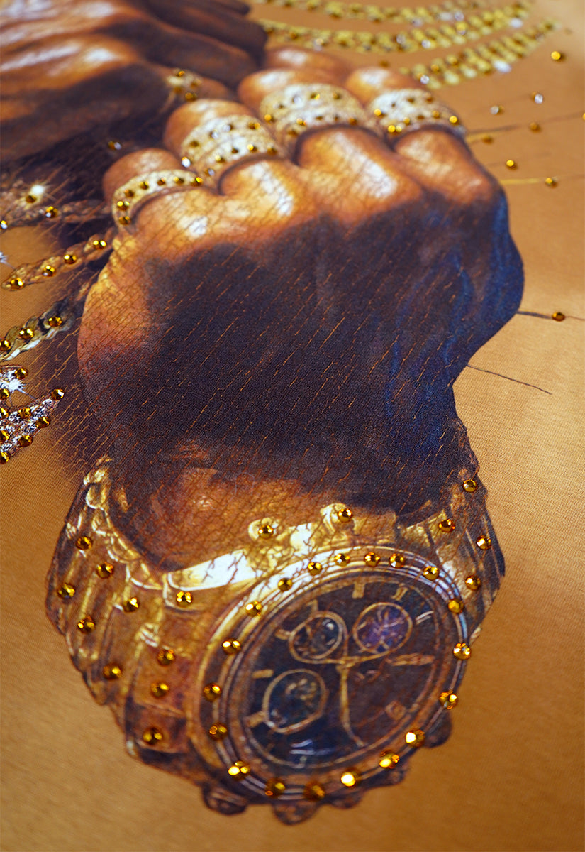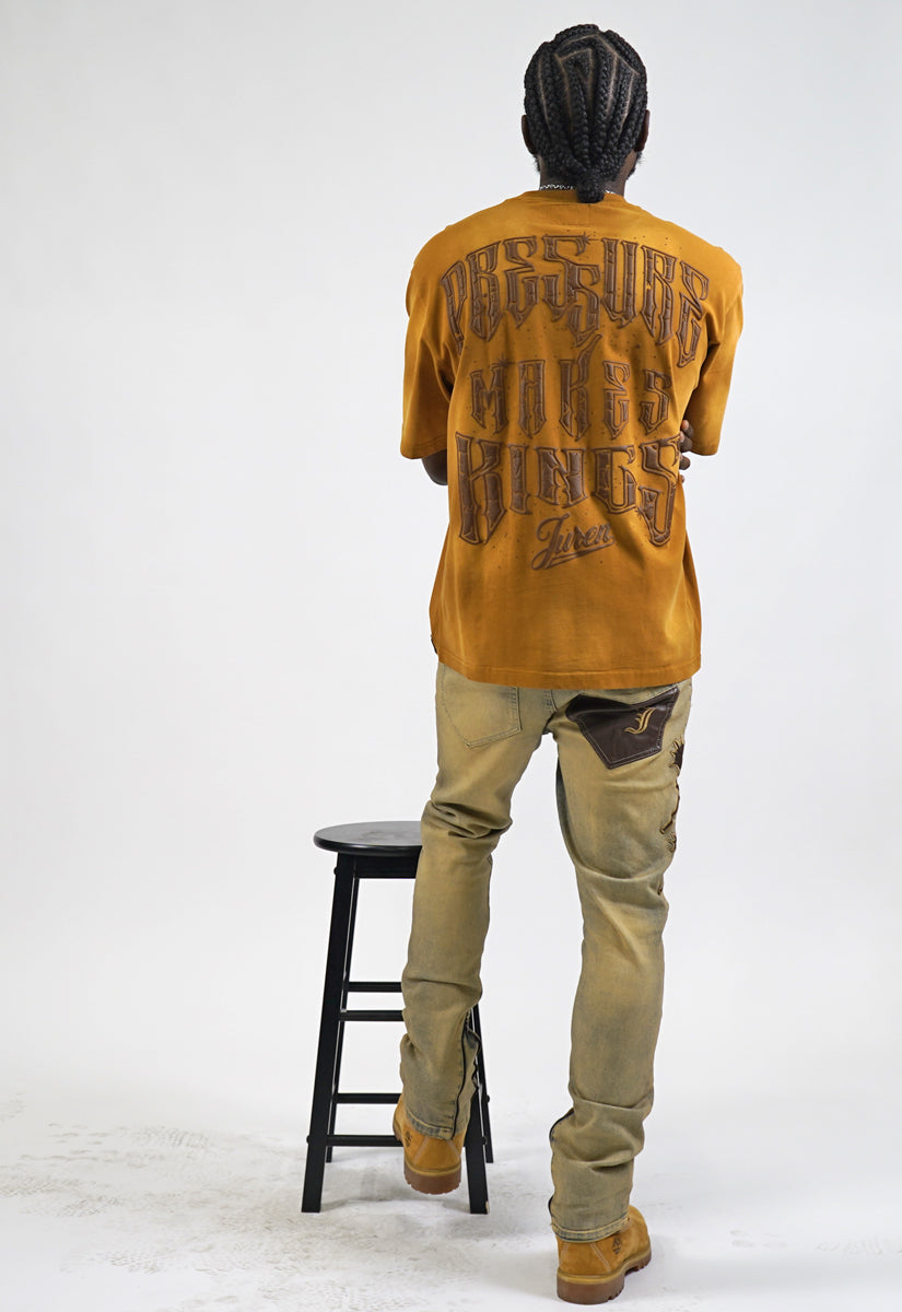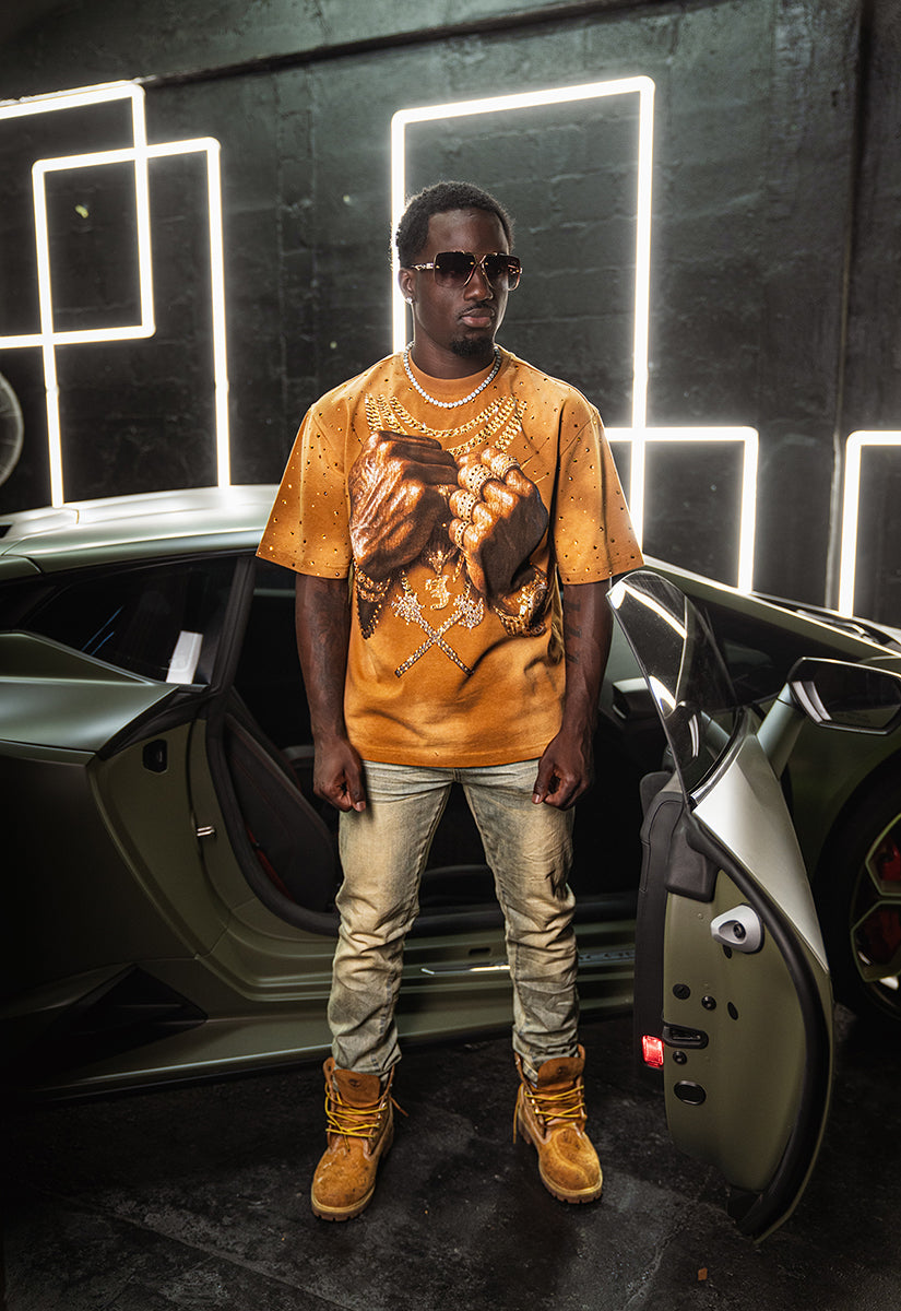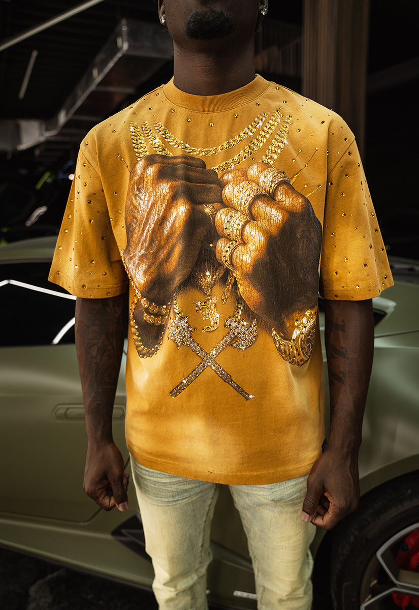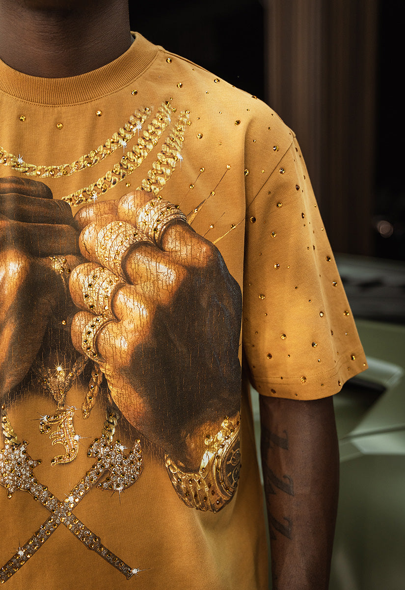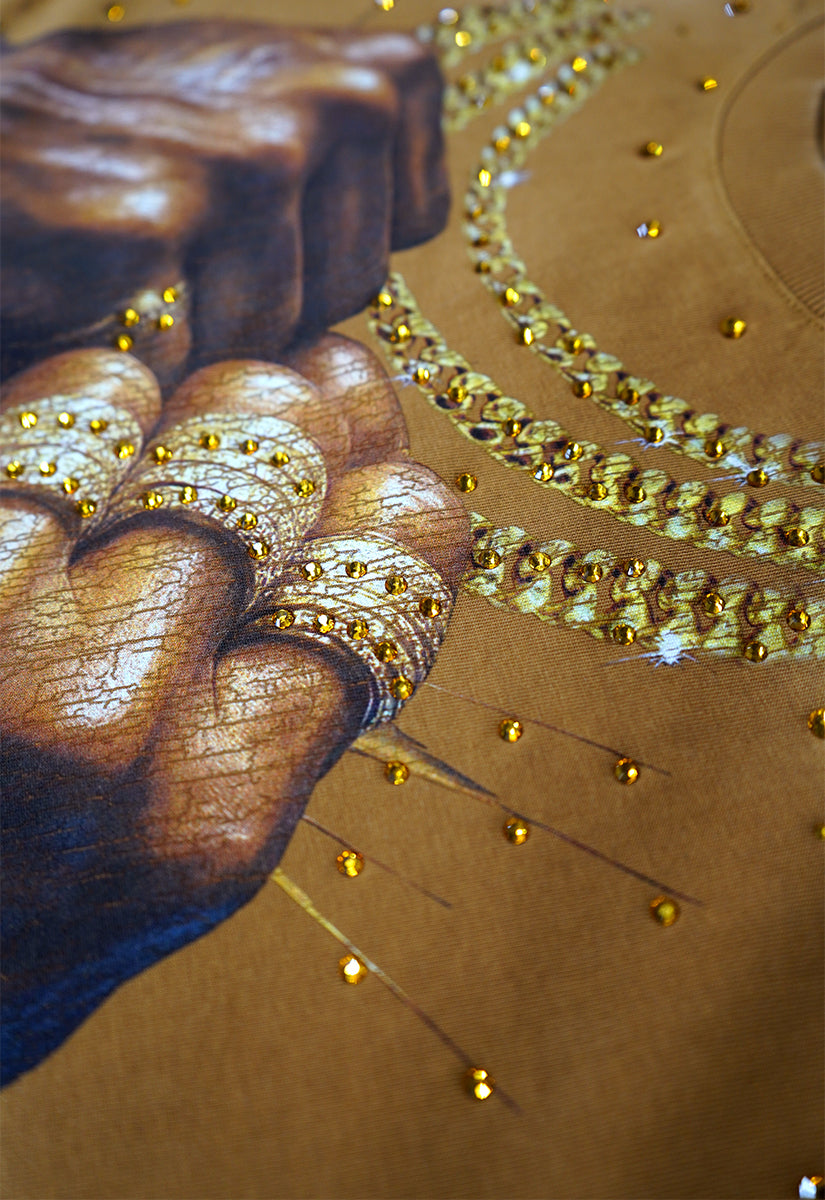 Pressure Makes Kings Light Cloudy Brown Shirt features a striking front design showcasing two powerful fists gripping ornate chains, adorned with rings, watches, and chain bracelets. The entire composition is embellished with Gold rhinestones that catch the light across every metallic element, creating a luxurious, eye-catching aesthetic. The "J" and battle axe are both enhanced with gold rhinestone detailing for added dimension and prestige. The back displays the iconic "PRESSURE MAKES KINGS" statement in bold darker brown puff gel print, accompanied by the Juren signature and battle axe emblem. This premium piece combines bold graphic artistry with meticulous embellishment work, making it a standout statement garment that celebrates ambition and strength. Perfect for those who embrace confidence and distinctive style.