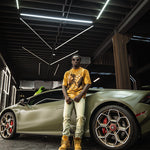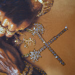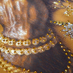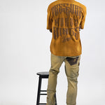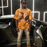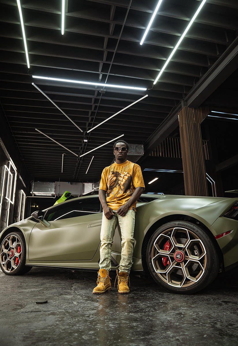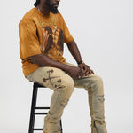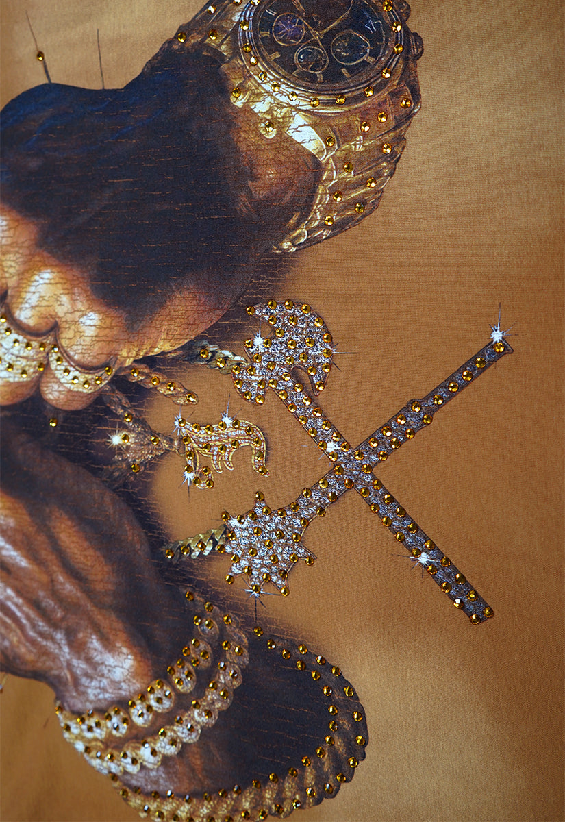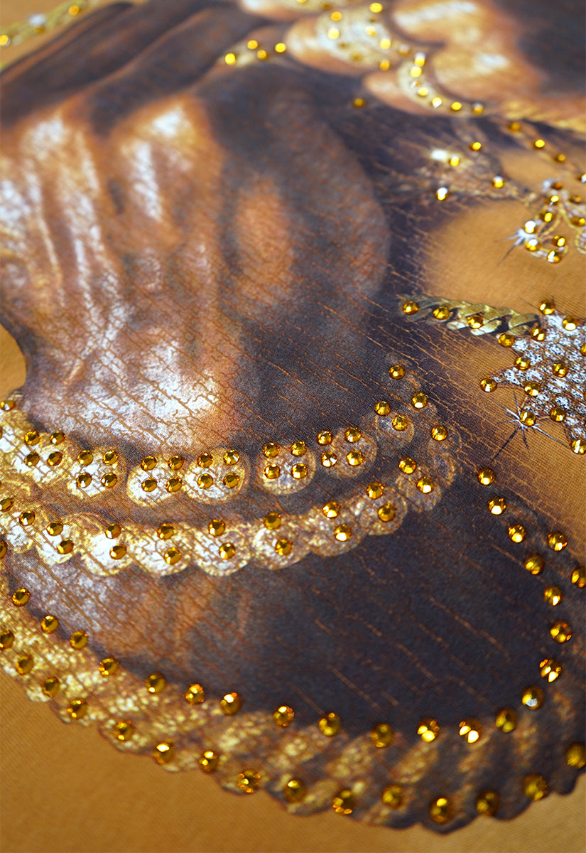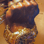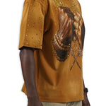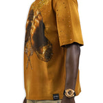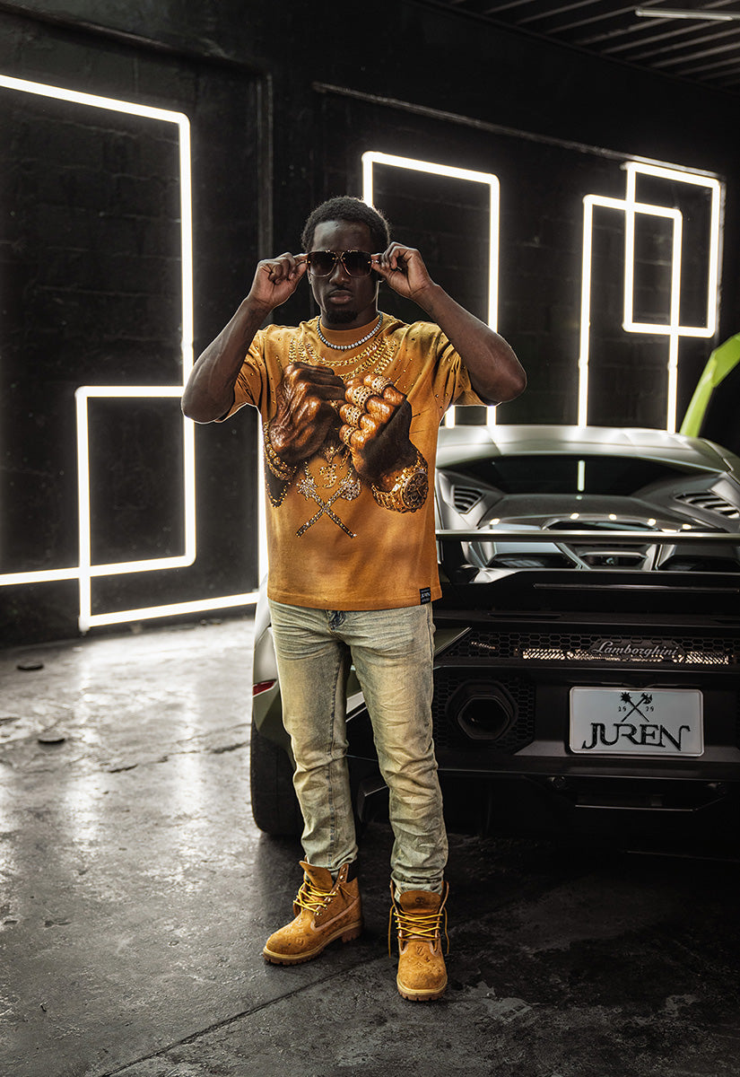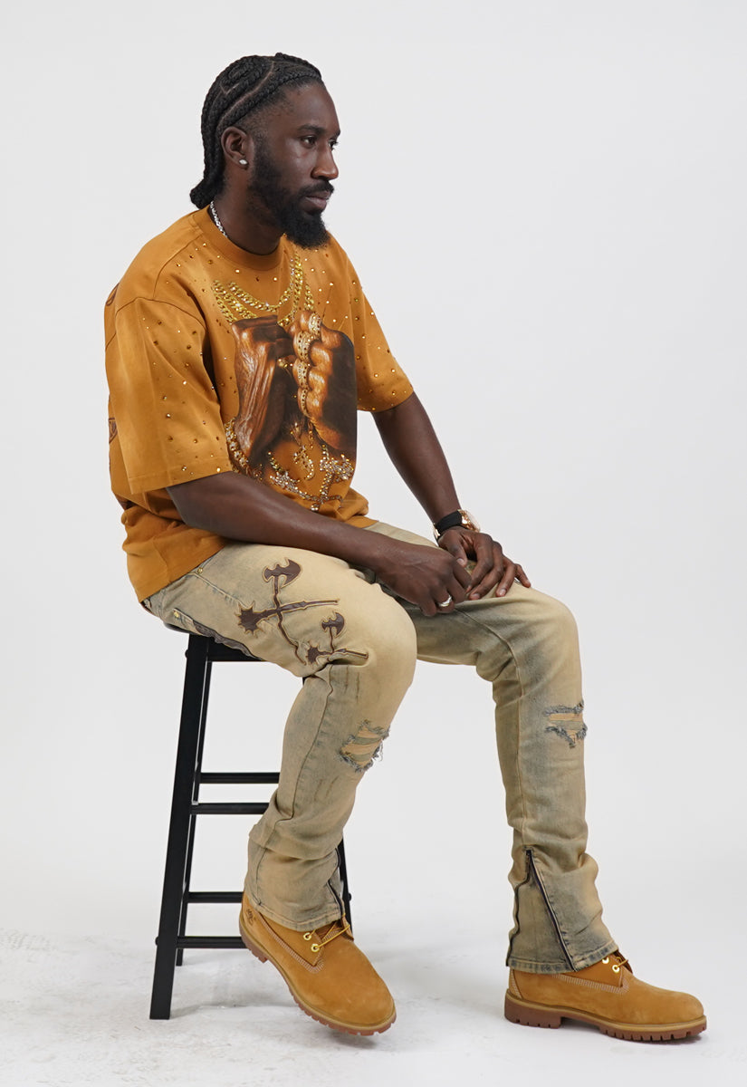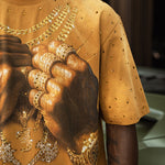Pressure Makes Kings Light Cloudy Brown Shirt features a striking front design showcasing two powerful fists gripping ornate chains, adorned with rings, watches, and chain bracelets. The entire composition is embellished with Gold rhinestones that catch the light across every metallic element, creating a luxurious, eye-catching aesthetic. The "J" and battle axe are both enhanced with gold rhinestone detailing for added dimension and prestige. The back displays the iconic "PRESSURE MAKES KINGS" statement in bold darker brown puff gel print, accompanied by the Juren signature and battle axe emblem. This premium piece combines bold graphic artistry with meticulous embellishment work, making it a standout statement garment that celebrates ambition and strength. Perfect for those who embrace confidence and distinctive style.