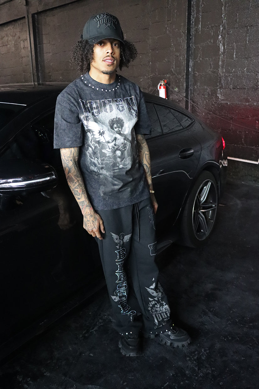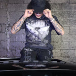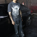 Stairway To Heaven Shirt features a striking black acid wash design that captures bold artistic vision. The front showcases an angular figure wielding the iconic Juren battle axe and battle bulb, creating a dynamic visual statement. The JUREN logo appears prominently across the chest in large capital letters, embellished with black and white rhinestones for added dimension and sophistication. Rhinestone detailing adorns the collar and sleeves, while the back features the JUREN name outlined entirely in rhinestones, ensuring eye-catching appeal from every angle. This shirt combines edgy aesthetics with premium embellishment, making it a standout piece for those who appreciate distinctive, statement-making apparel.