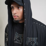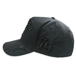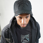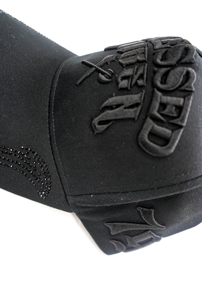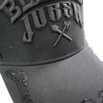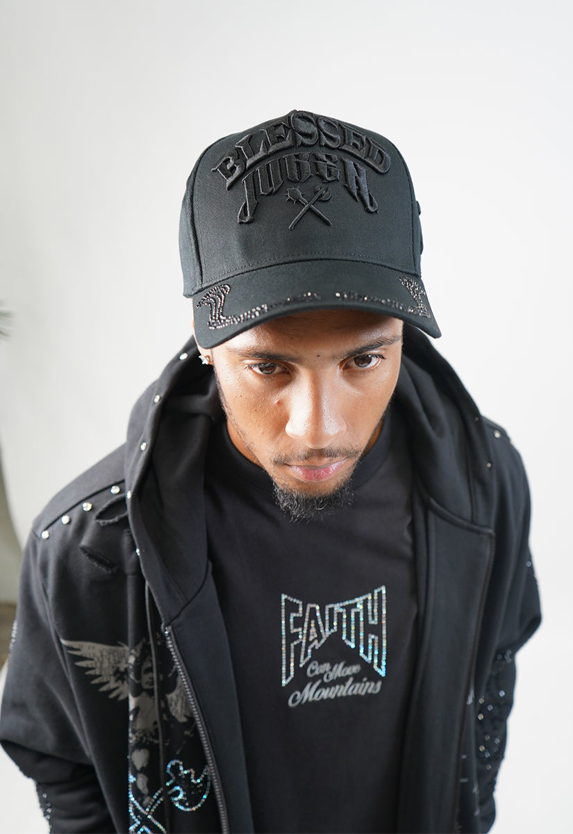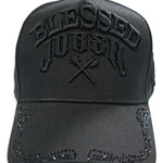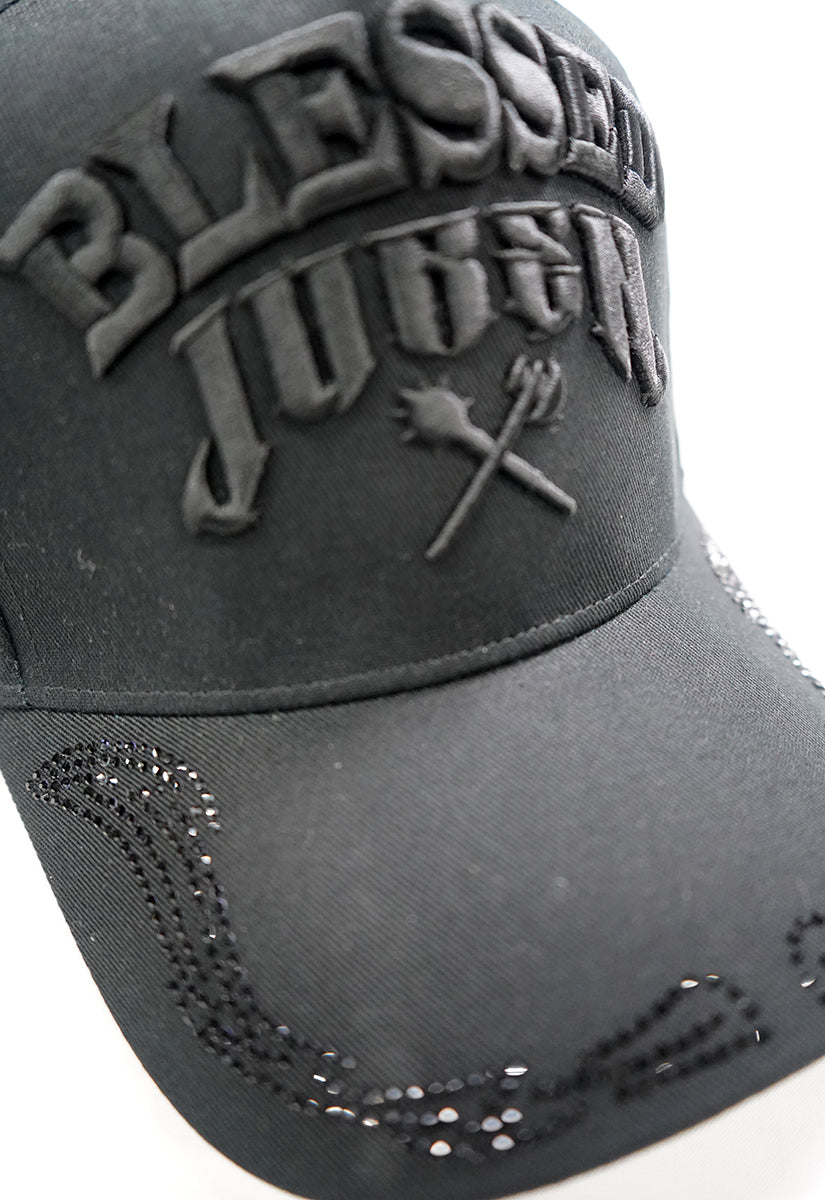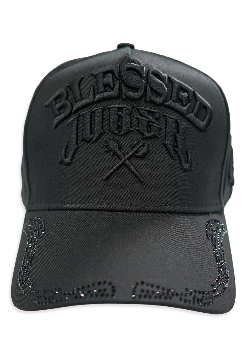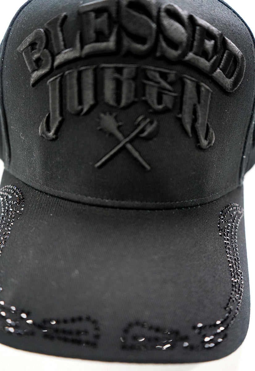 Elevate your headwear collection with the Stairway To Heaven Trucker Hat, a statement piece that combines classic trucker styling with meaningful symbolism. This all-black cap features premium puff embroidery detailing on the front, showcasing the words "Blessed Juren" alongside the iconic Battle Axe Club logo. The back displays Roman numerals (MCMLXXIX) in matching black embroidery, adding a sophisticated historical reference. Crafted for those who appreciate bold design and cultural significance, this trucker hat delivers both comfort and distinctive style. The structured six-panel construction and mesh back panels ensure breathability, making it ideal for everyday wear or as a collectible piece for enthusiasts. Perfect for anyone seeking authentic streetwear with purpose and presence. On the Visor flame outline black rhinestones.
