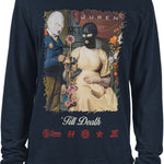 The "'Till Death Navy Crewneck Sweater" captures a poignant image of love and loyalty with its depiction of two figures wearing balaclavas embracing each other. Against the deep black fabric, this graphic evokes a sense of unity and strength in the face of adversity. Perfect for those who appreciate unconventional romance and edgy style, wear it proudly as a symbol of unwavering commitment and connection.